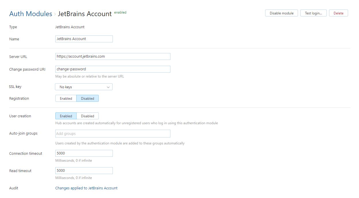 Audit | Links to the Audit Events page in YouTrack Standalone. There, you can view a list of changes that were applied to this authentication module. |