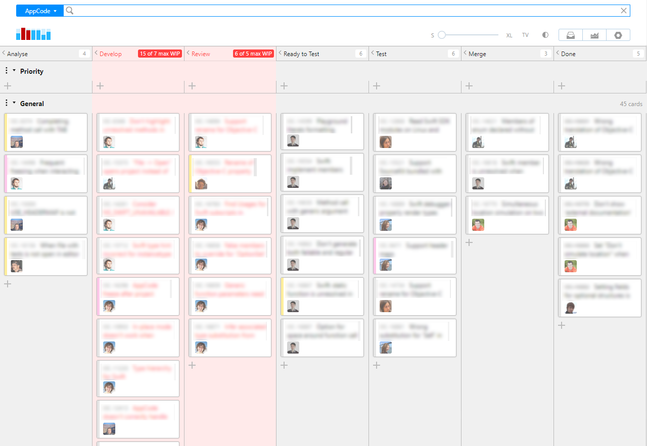 Our product teams at JetBrains establish their own workflows to match their goals, working habits, and personality. The development teams for AppCode and CLion follow a Kanban-inspired framework. They use Kanban boards to manage everyday activities related to the development of these two IDEs.