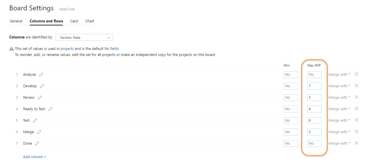 On this board, columns are identified by values from the Kanban State field. The values in this field represent the stages in their development process. They use the stages Analyze, Develop, Review, Ready to test, Test, Merge, and Done. Merge is a special stage where a task is ready but not yet published in the release branch. When the task is merged to the release branch, it moves to the Done column. Every stage in the development process is used as a column on the board.