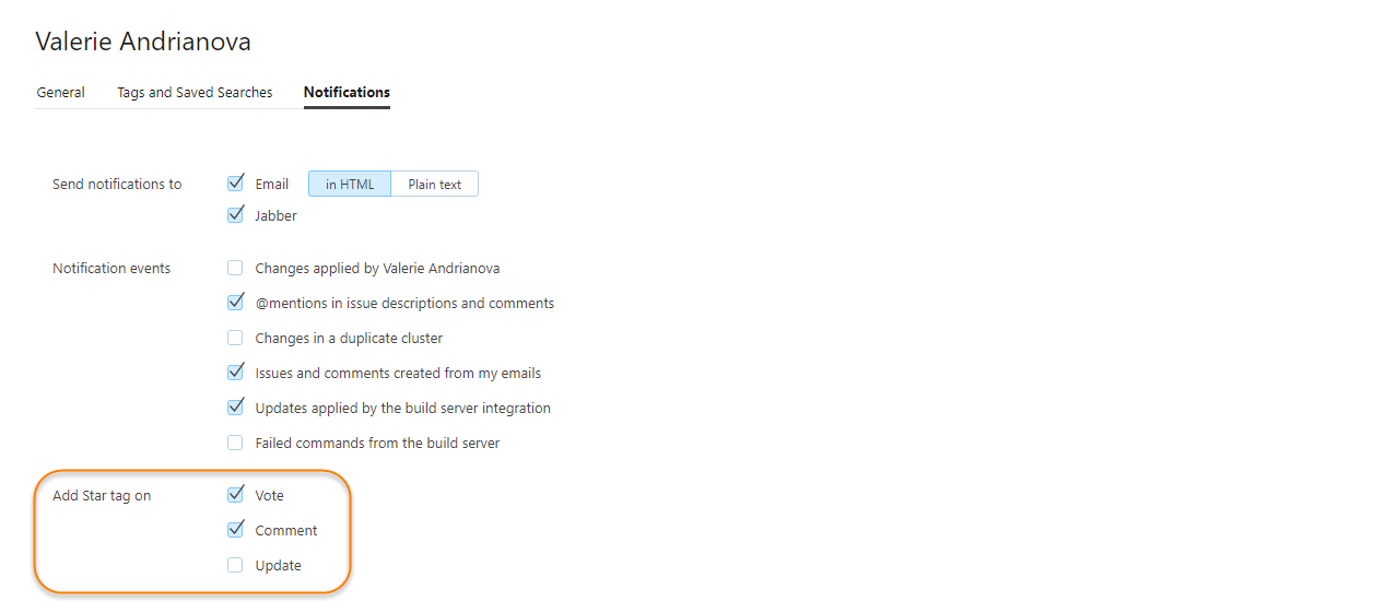 The first time you add the Star tag to an issue, a subscription to issues with this tag is added to your notification scheme. You can choose which events generate notifications for issues with this tag just as you can with any other subscription. To stop receiving notifications for an issue, simply remove the tag.