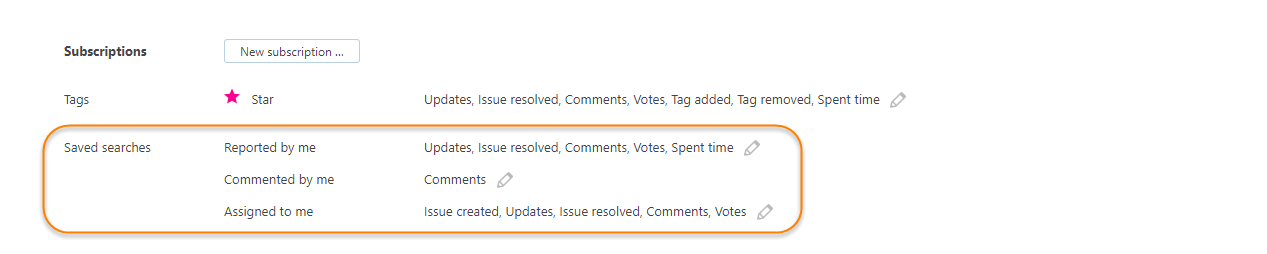 For each subscription, you have the option to get notified when issues are created, updated, have new comments, votes, spent time, or are resolved. With subscriptions for tags, you can also get notified when the tag is added to or removed from an issue.