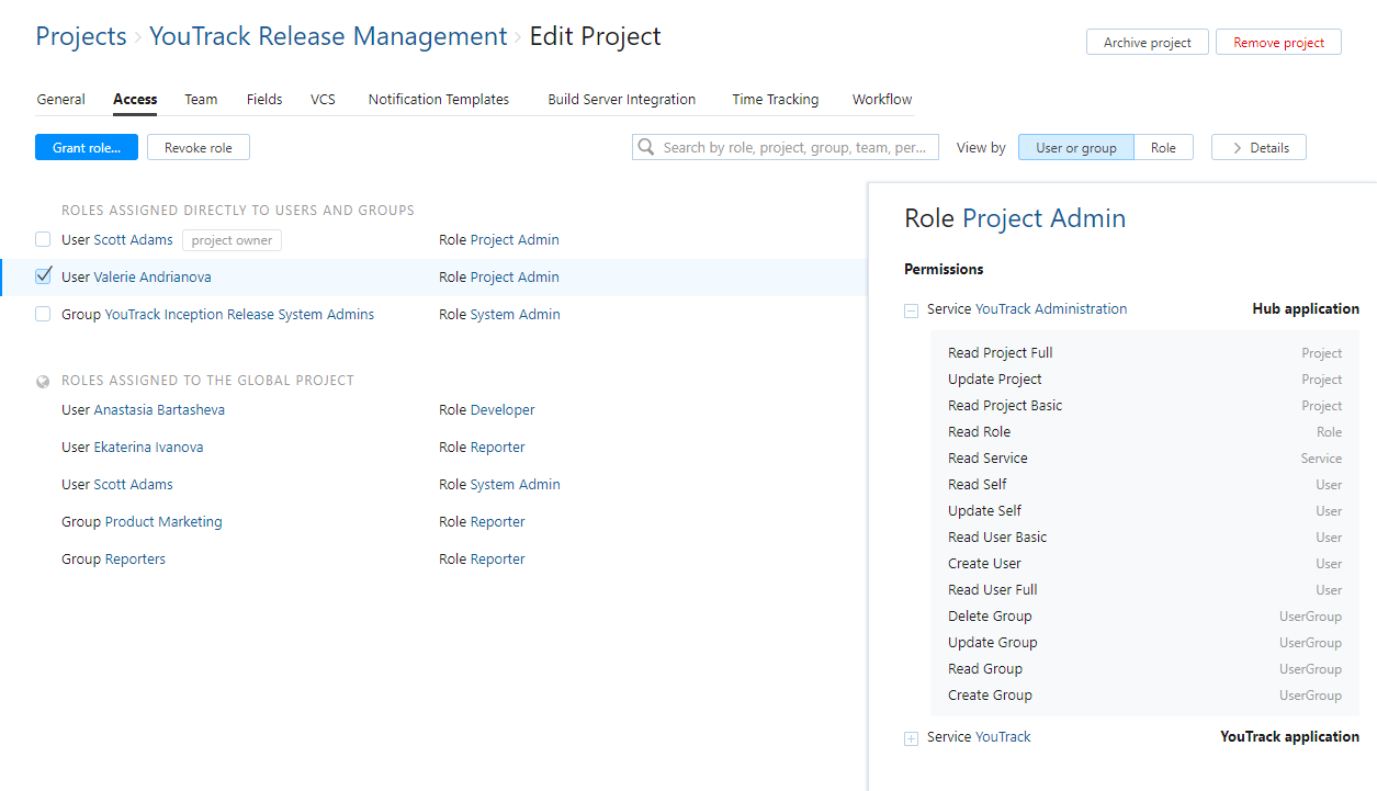 On the Access tab of the Edit Project page, you can see which roles are granted to users and groups in the project. This includes roles that are assigned to members of the project team as well as roles that are assigned to other users and groups directly. Use this information to determine how specific users are granted access to the project and view which actions they have permission to perform.