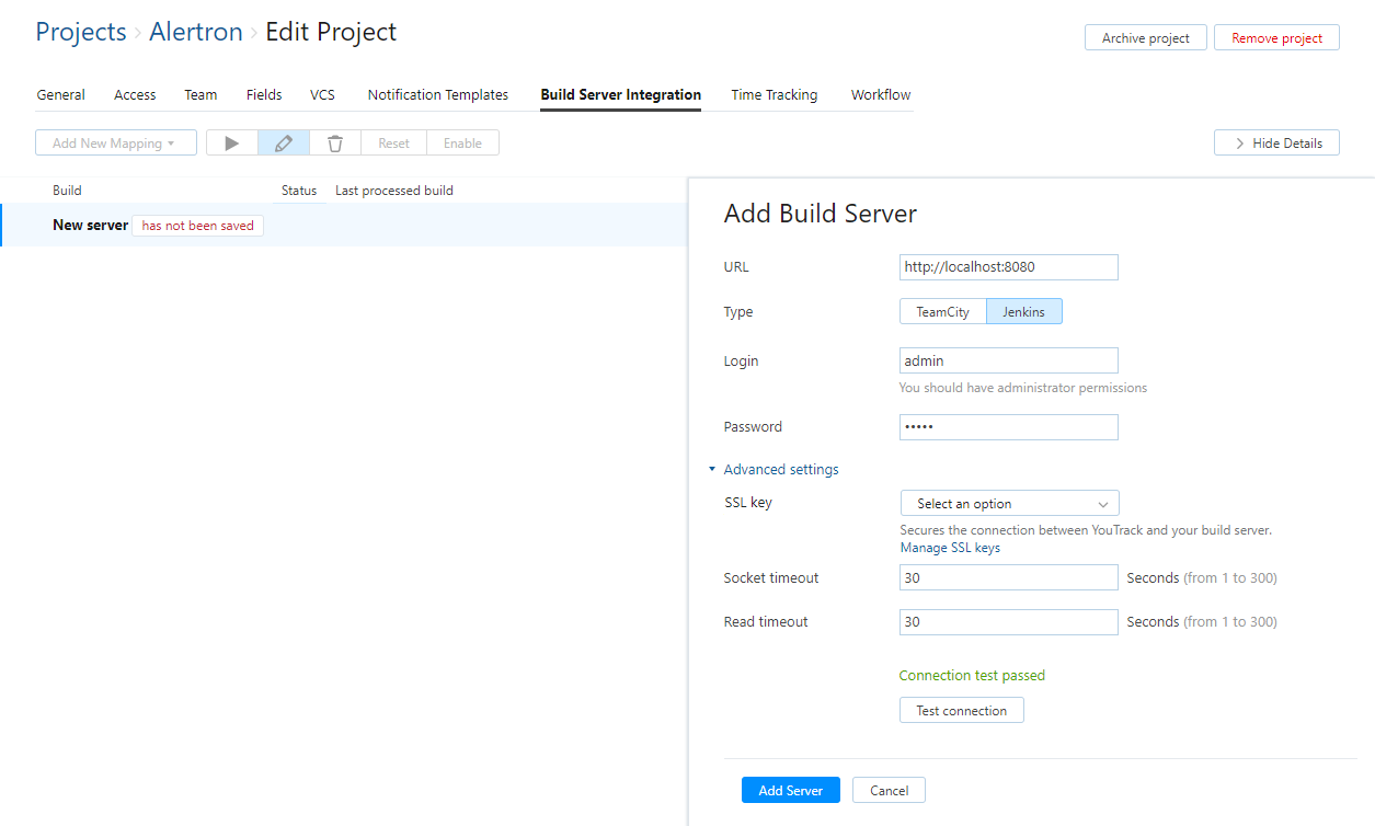 To enable the integration in your project, YouTrack needs a connection to at least one Jenkins server. If you have sufficient permissions in Jenkins, you can establish the connection yourself.