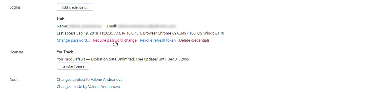 As an administrator, you can require that specific users change their passwords. This action is available in the Hub account for each user.