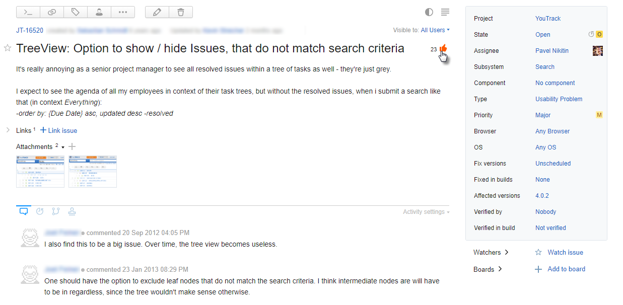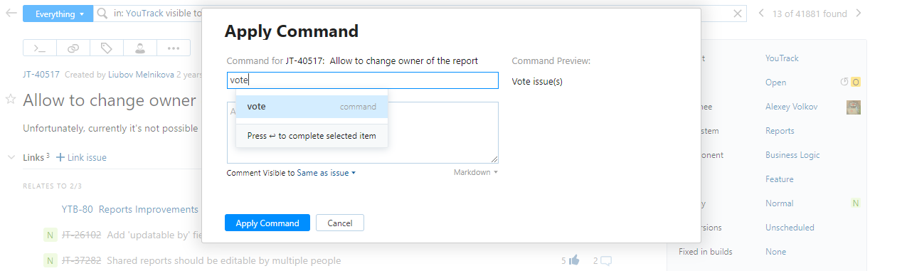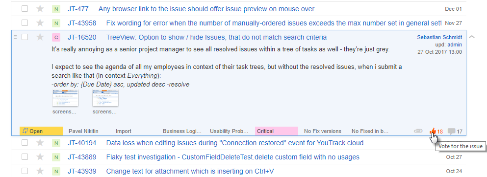 When the One Vote Comment workflow is attached to a project, a vote is automatically added to an issue when you author a comment that contains +1.