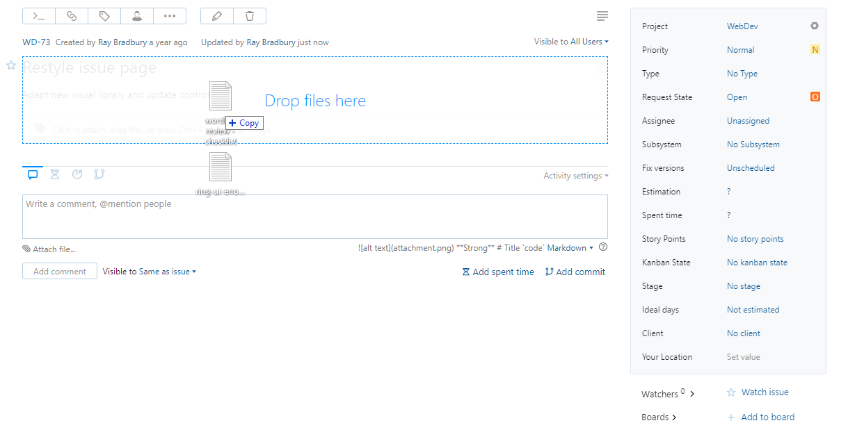 You can attach a file simply by dragging it to an issue.