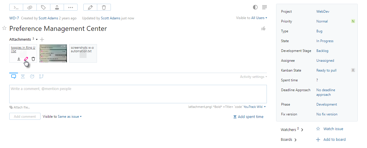 The instructions on this page describe how to attach files directly to an issue. To learn more about attaching files to comments, see Attach Files to Comments.