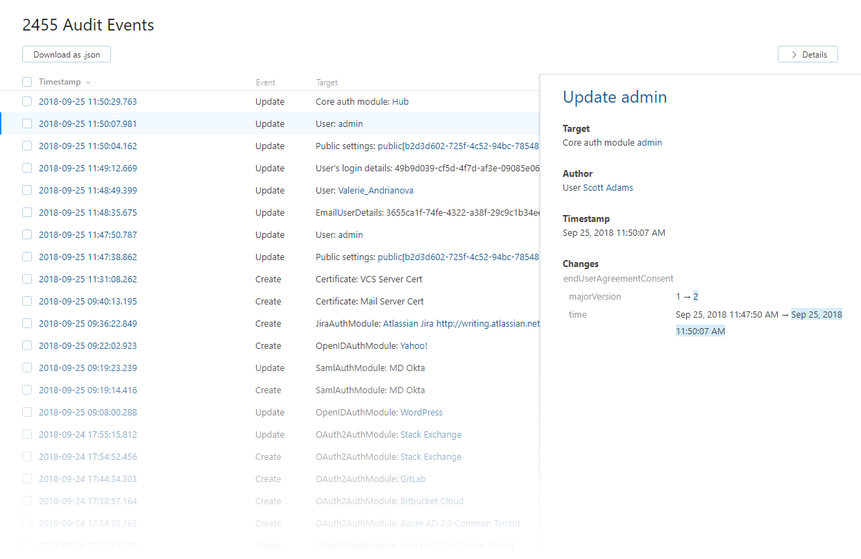 You can also download information about any event as a JSON file for further investigation. To do so, select one or several events in the list and click the Download as .json button.