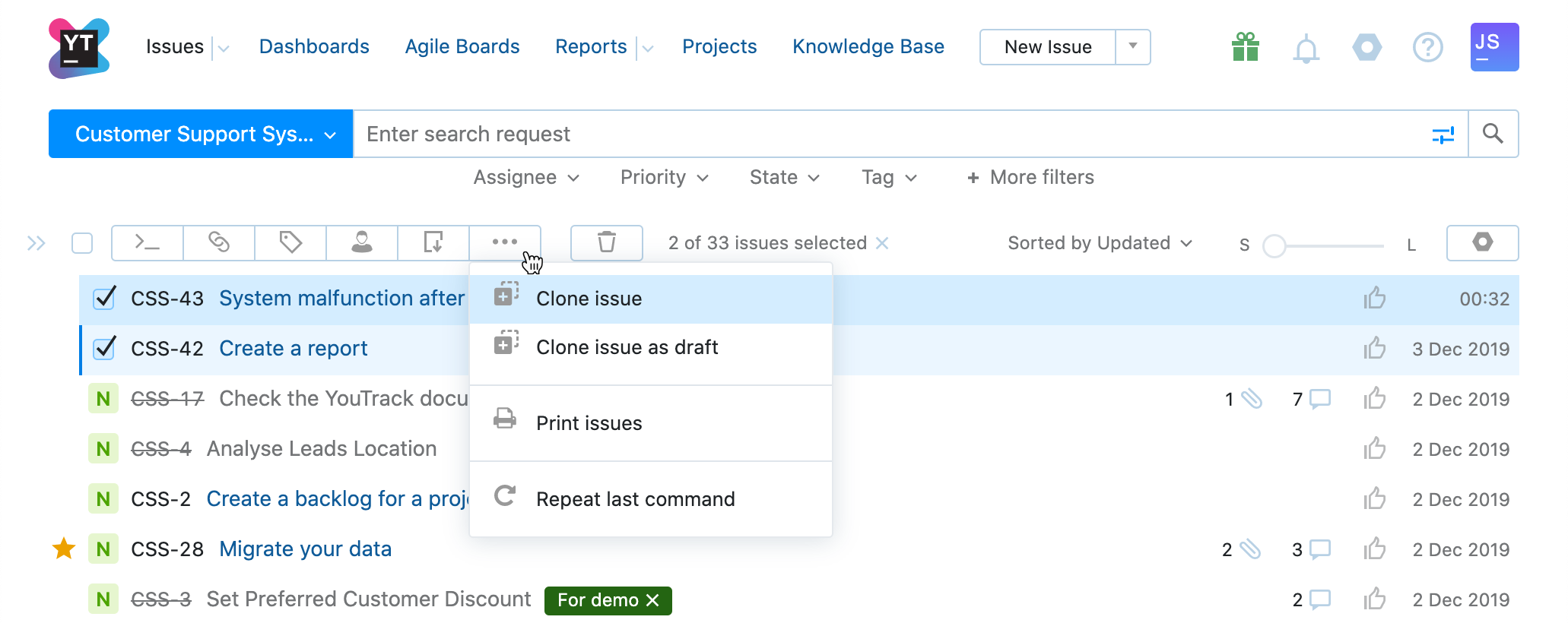 Clone an issue: Creates a copy of one or several selected issues and reports them in the same project as the source one.