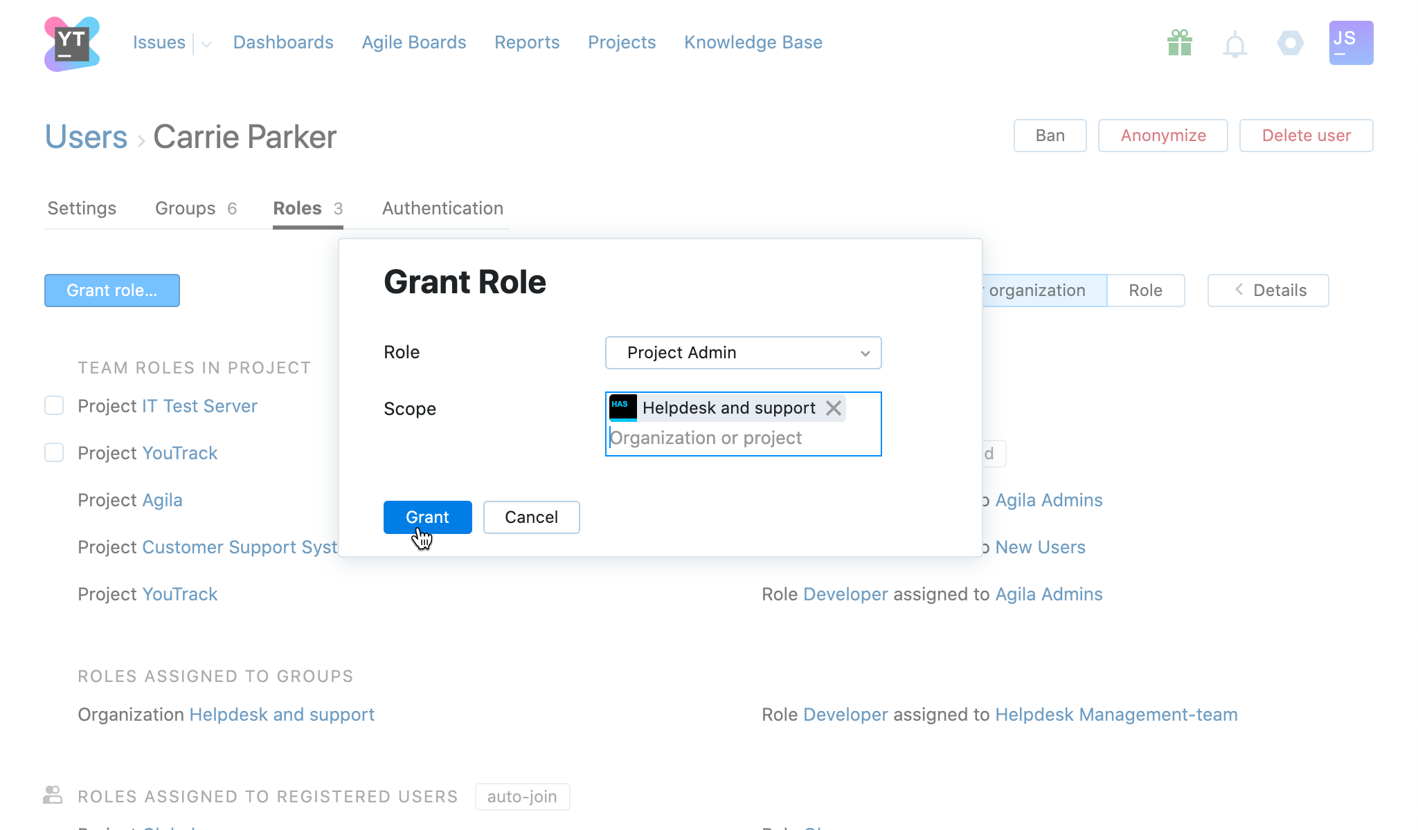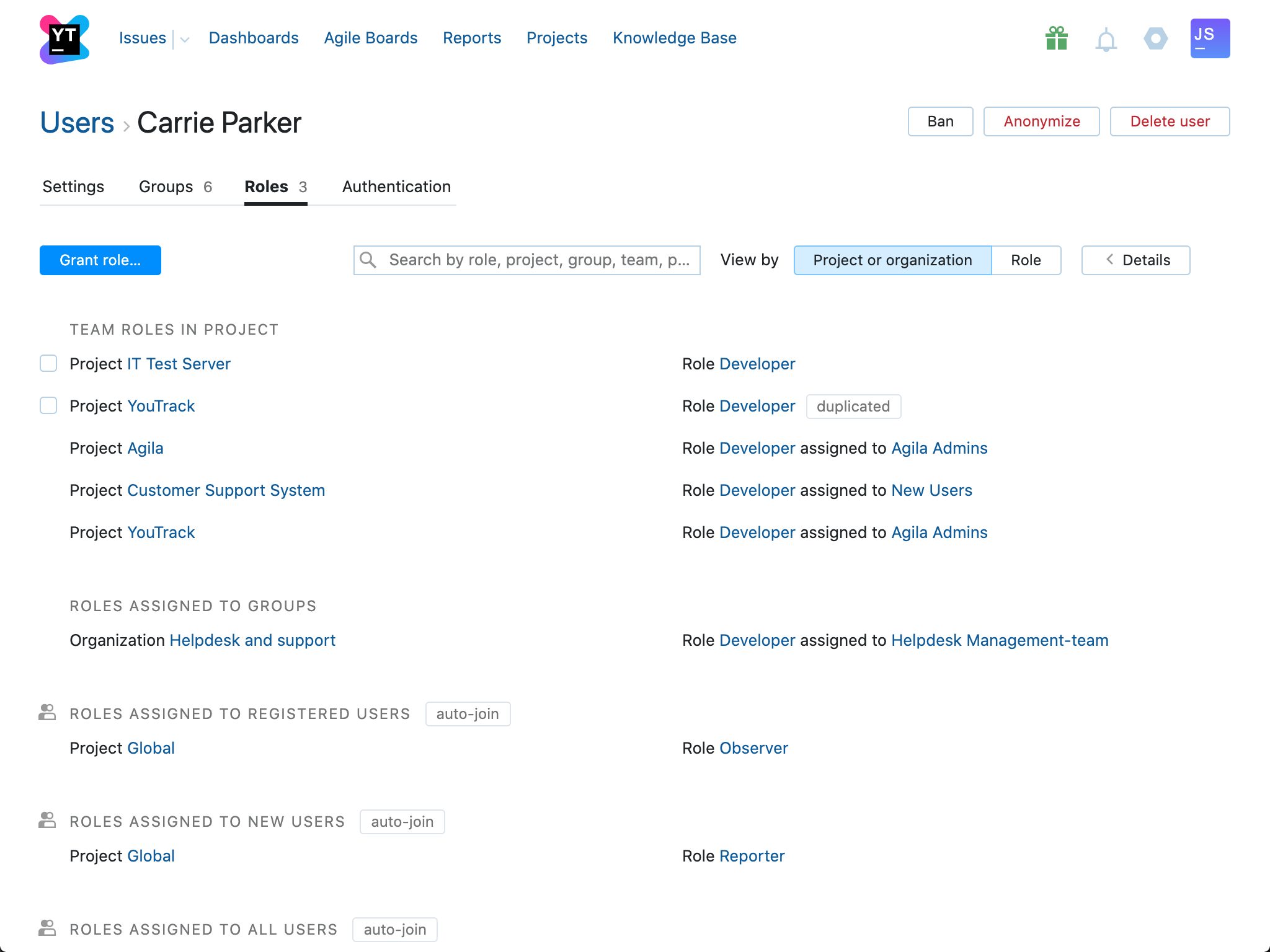 Nested under each role is the reason for the assignment. Here you see whether the user is granted a role in a project or an organization as a member of a group, a member of the project team, or with a direct assignment.