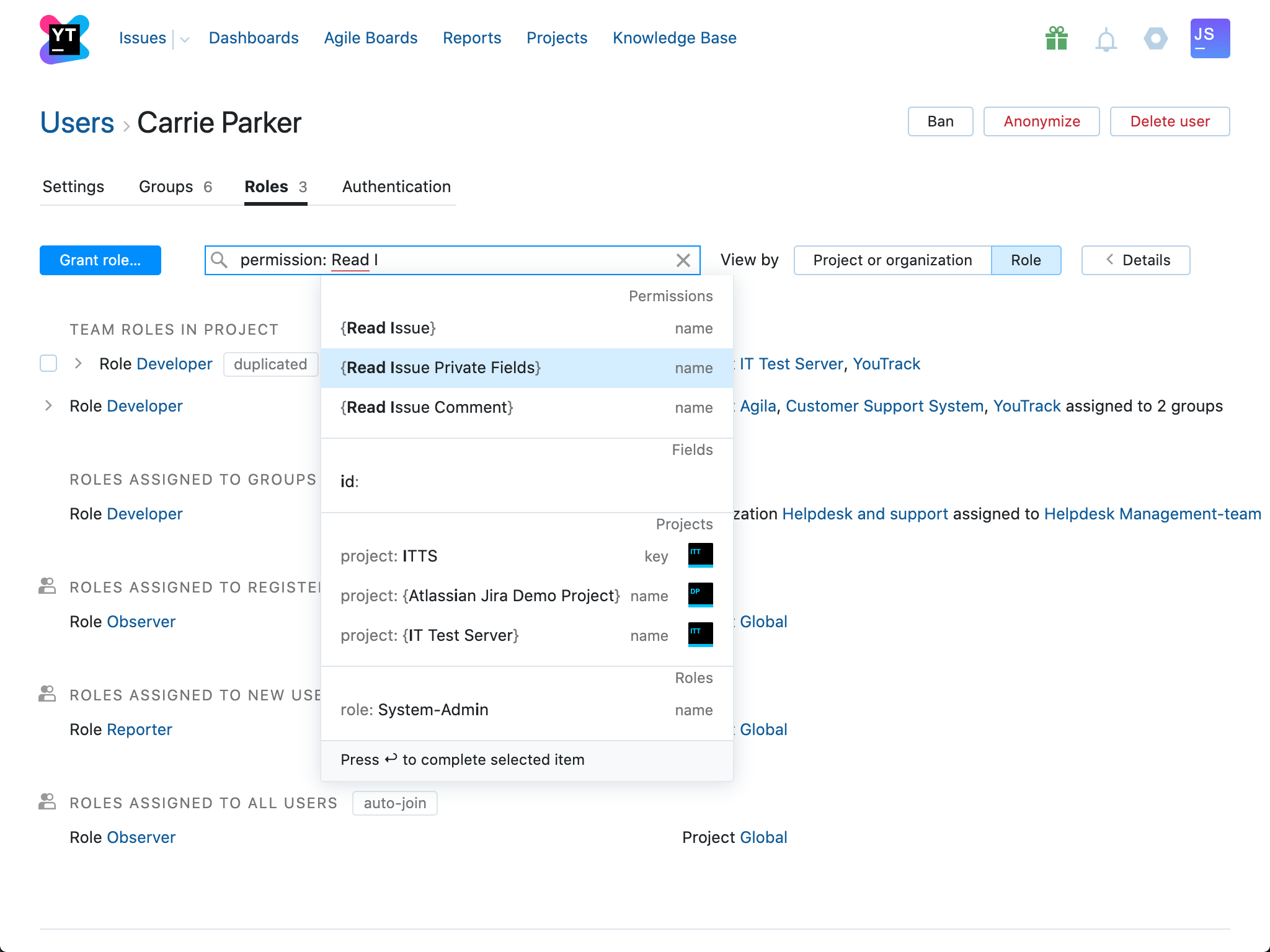 The Roles tab lets you view and manage the permissions that are available to a single user account. Users are granted permissions based on the roles that they are assigned in one or more projects.