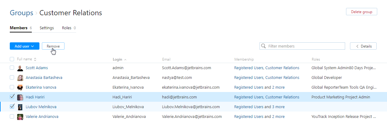 You can remove user accounts from a group. Any access permissions that are granted to this group are revoked from the user accounts.