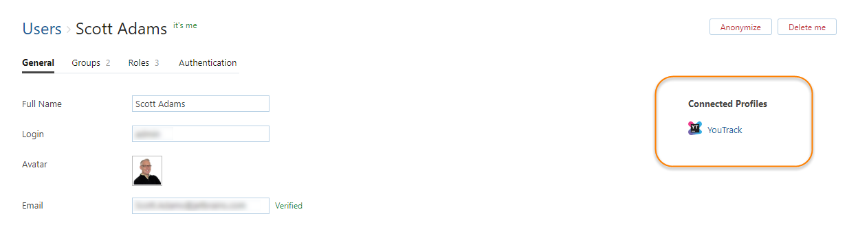 • If your YouTrack Standalone installation uses the built-in Hub service, or you use YouTrack InCloud, you only see the link to the current user's YouTrack profile. Your YouTrack service doesn't support connections user profiles in other JetBrains applications.