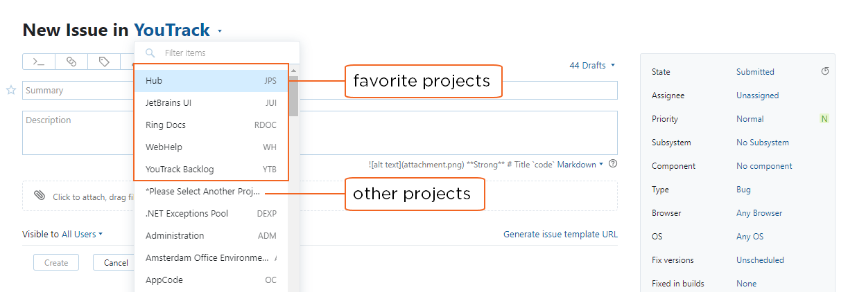 To report the issue in another project, select another value from the project list in the header. Projects that you have marked as your favorites are shown at the top of the list.