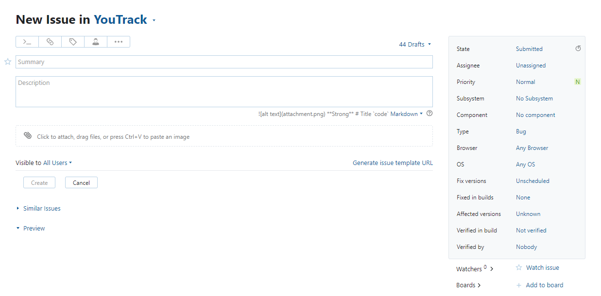 • To close the New Issue page without reporting the issue, press Esc or click the Close. The current issue is saved as a draft. The next time you create an issue, you can reload the draft from the Drafts list toolbar.