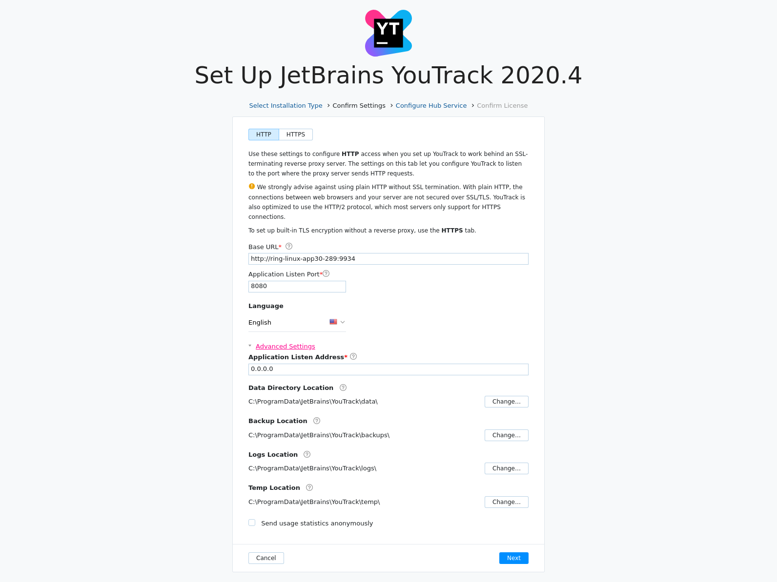 Expand the Advanced Settings section to confirm or change the locations where YouTrack Standalone stores product data.