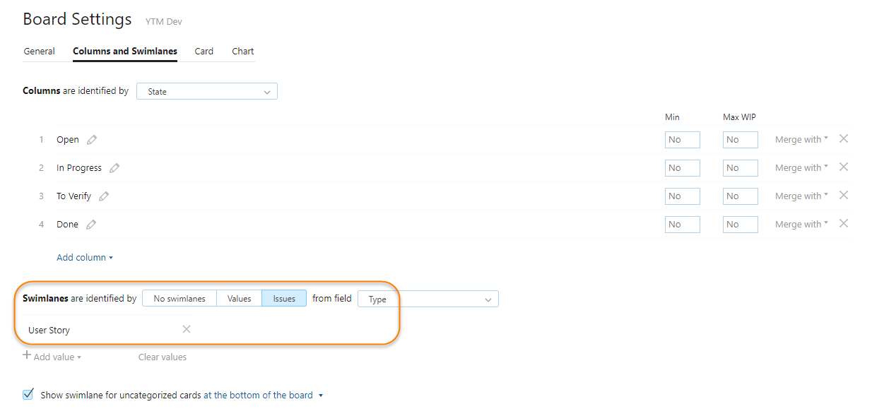 3. On the Columns and Swimlanes tab, check the Swimlane settings. This setting should already identify swimlanes by issues from the Type field and use User Story.