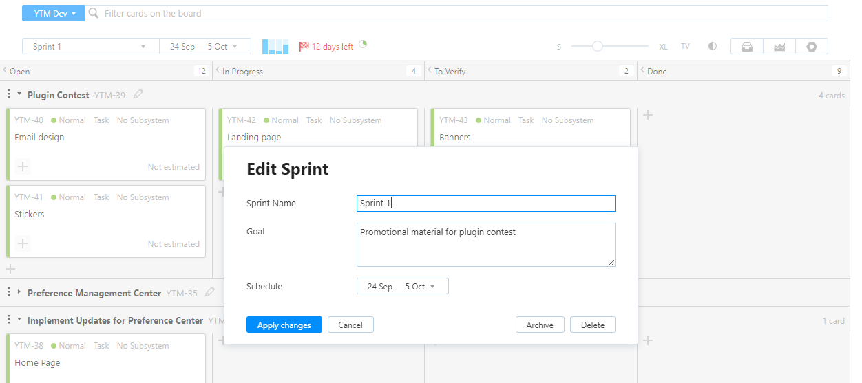 • Set the sprint Schedule. Sprints on the Project Management board usually represent a series of iterations that span several months.