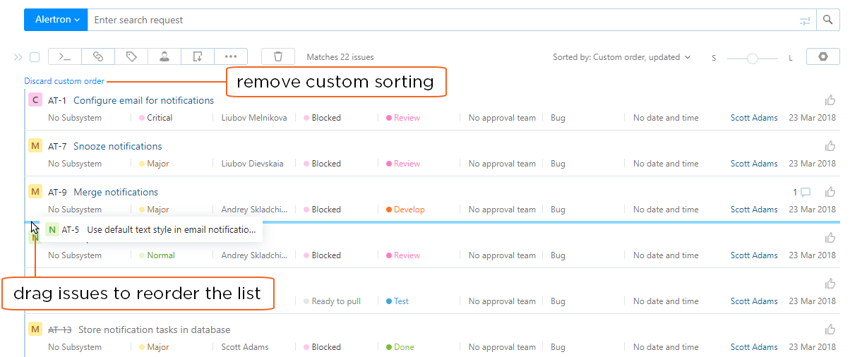 YouTrack allows you to sort issues in the search results manually by dragging them in the list and placing them in the desired order. Whenever the custom order is applied, it is saved for the currently selected search context. The next time you perform the same search query with the same context — you see the previously arranged custom order.