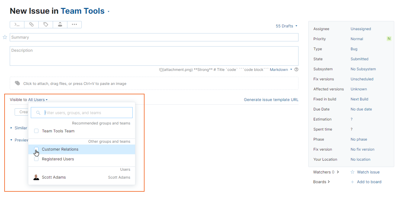 In the issue draft, click the Visible to list. This option appears directly above the Create button.