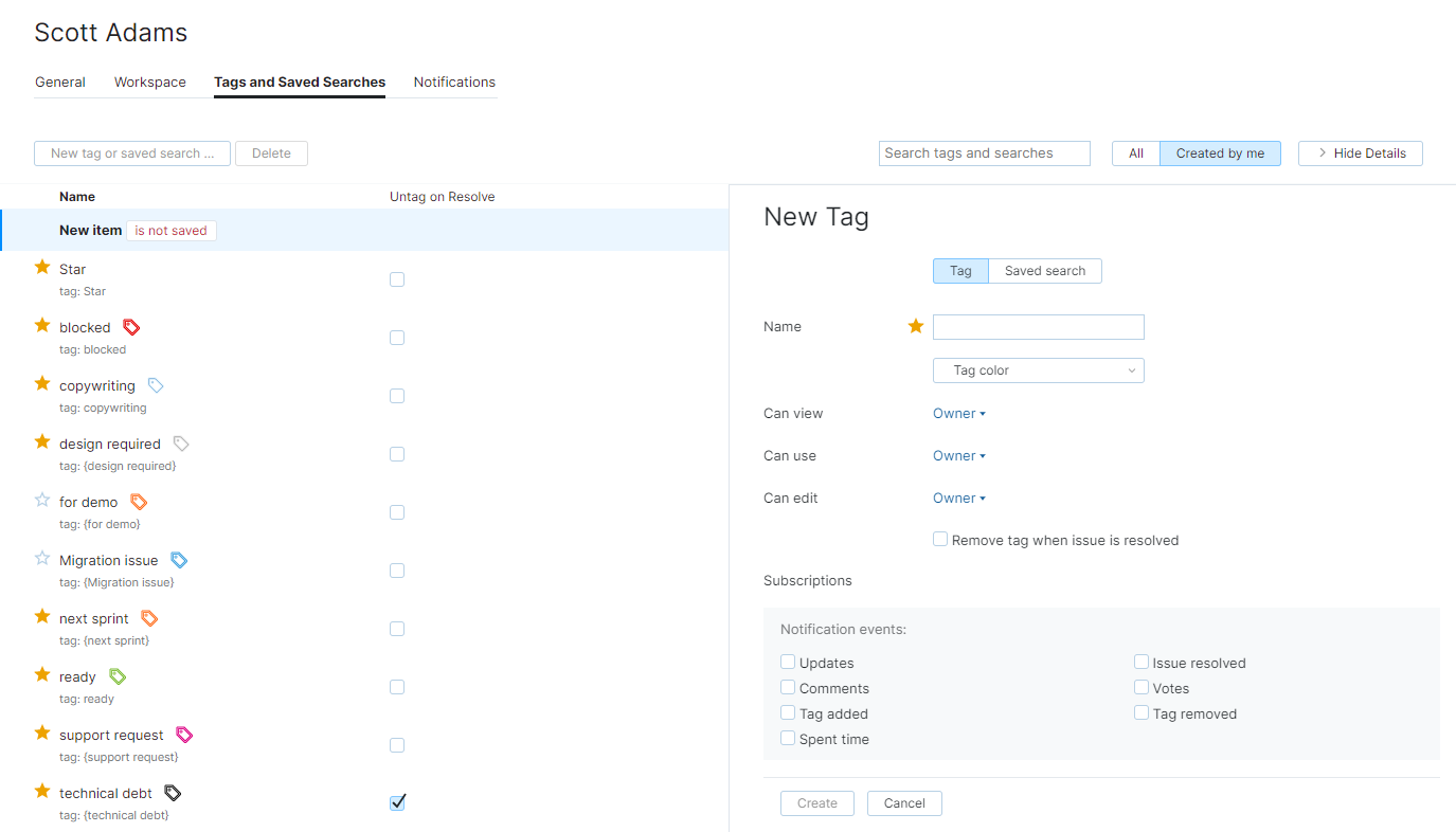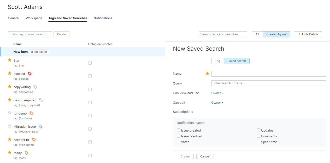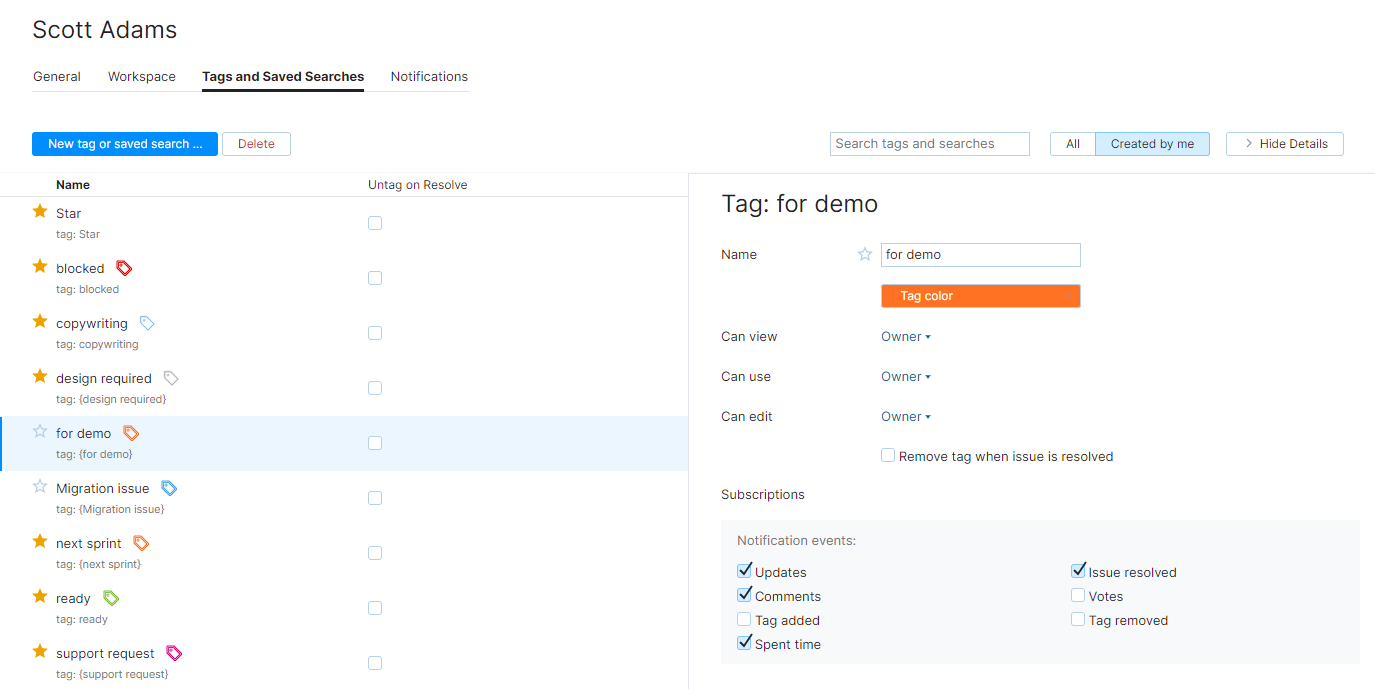 The Tags and Saved Searches tab lets you view and manage tags and saved searches that you have created in YouTrack. You can also view tags and saved searches that have been shared with you. To access this page, click your avatar, select the Profile link, then select the Tags and Saved Searches tab.