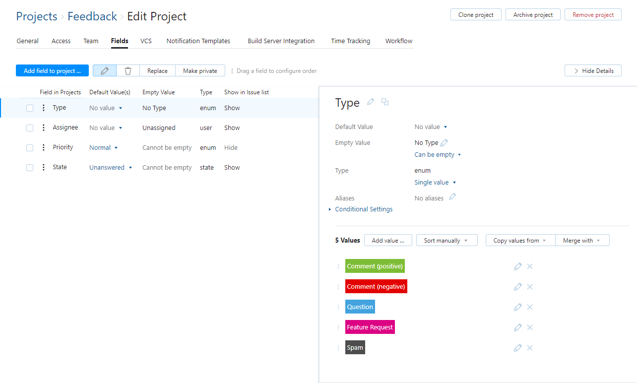 Configure the custom fields that you want to use in the project. For a feedback project, you can get by with Type, Priority, Assignee, and State. The project administrator can add more custom fields as needed.
