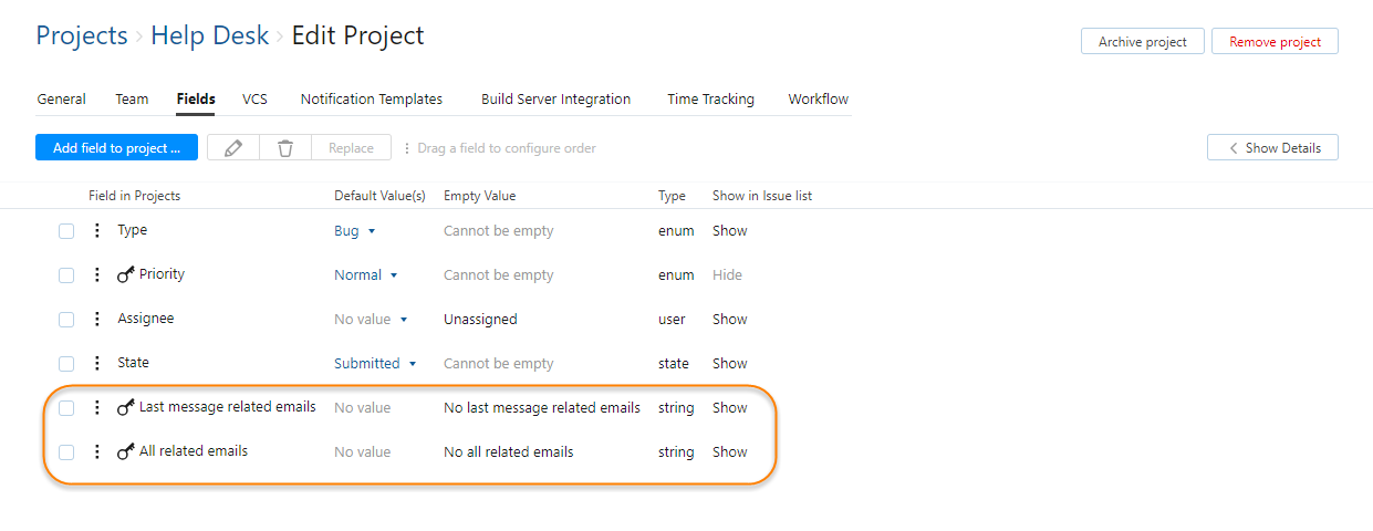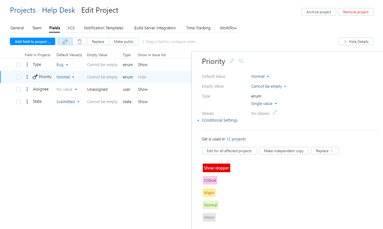 Configure the custom fields that you want to use in the project. For a help desk, you can get by with Type, Priority, Assignee, and State. The project administrator can add more custom fields as needed.