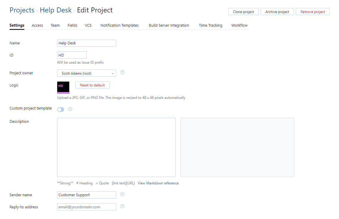 If your YouTrack installation is connected to your own email service, you can customize the From address. Enter the email address that you want to use to send notifications for the help desk project.
