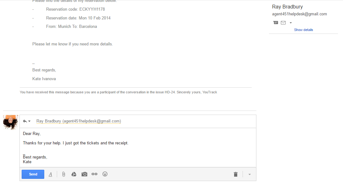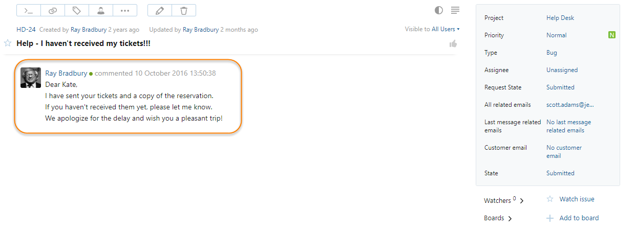 Now that you've configured YouTrack to function as a help desk, let's see how it works. Here is how YouTrack handles a sample customer request.