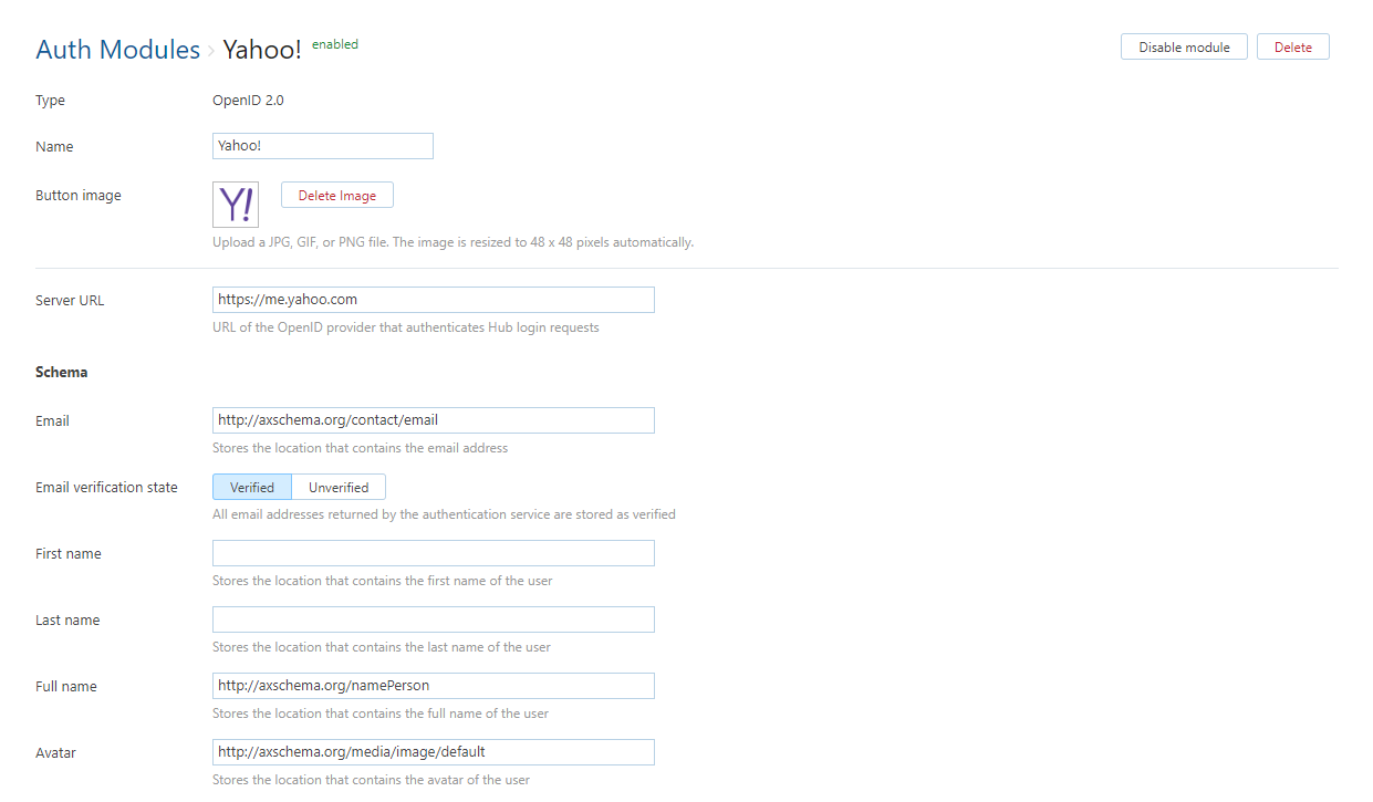• The Auth Modules page displays the settings for the Yahoo! authentication module. For additional information about the settings on this page, see Settings.