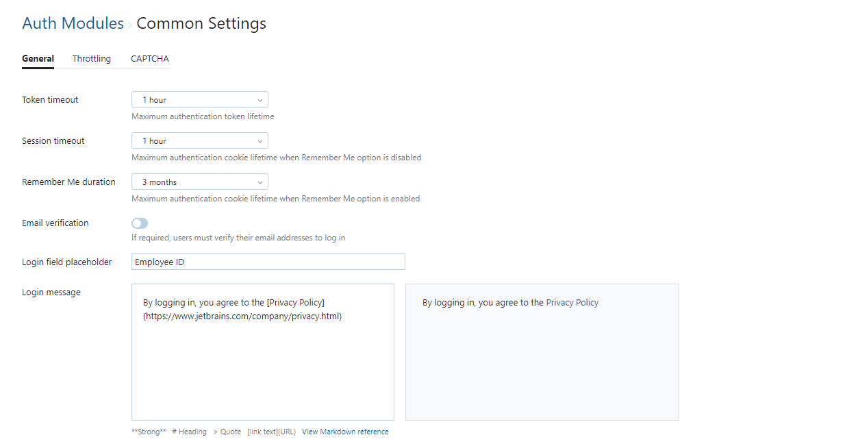 Login message | Adds a message to the login page for your YouTrack Standalone installation. Use this, for example, to provide a link to legal documents that describe how you manage personal data that is stored in the application. This setting supports the standard Markdown implementation as described in the the CommonMark specification. Many of the extensions that are supported in issue fields are not available here. For details, see Markdown Syntax. |
