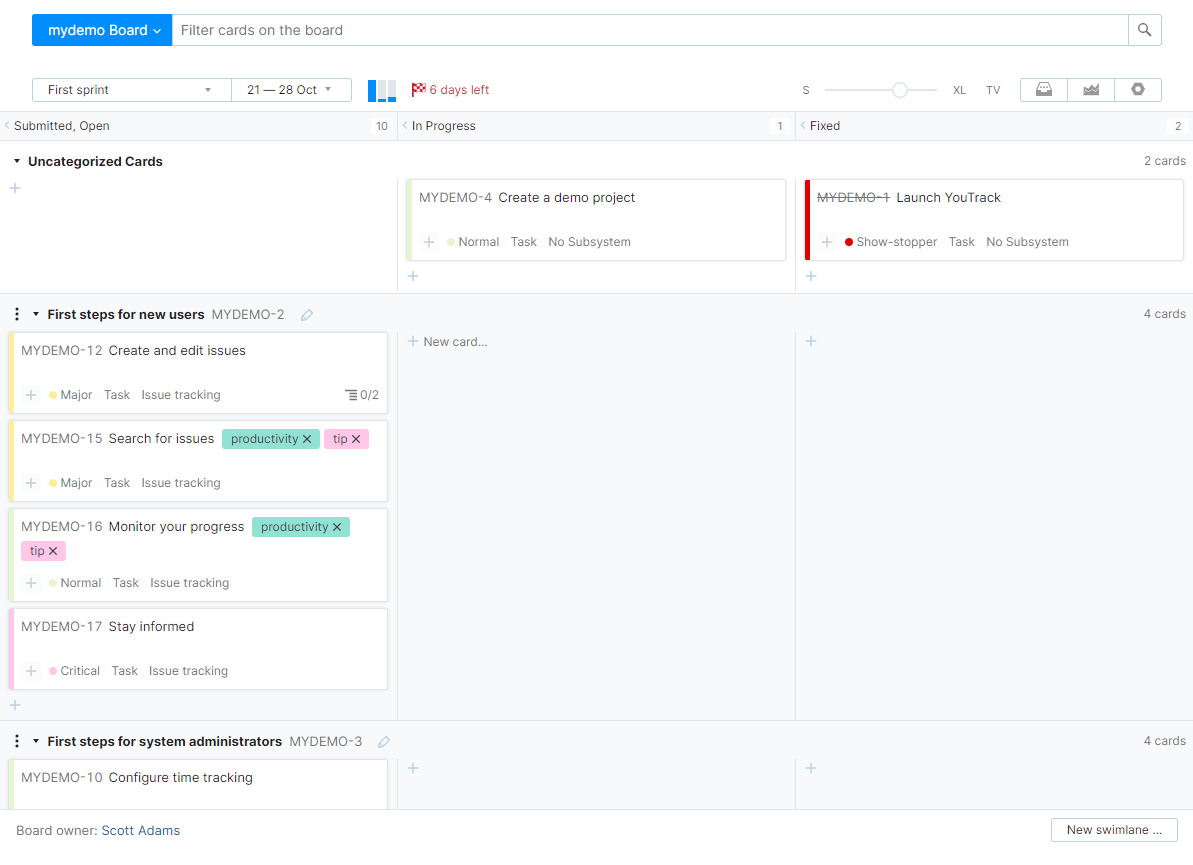 The demo project contains a preconfigured set of sample issues that help you become more familiar with key features in YouTrack. The demo project also includes a collection of agile boards, reports, and a dashboard.