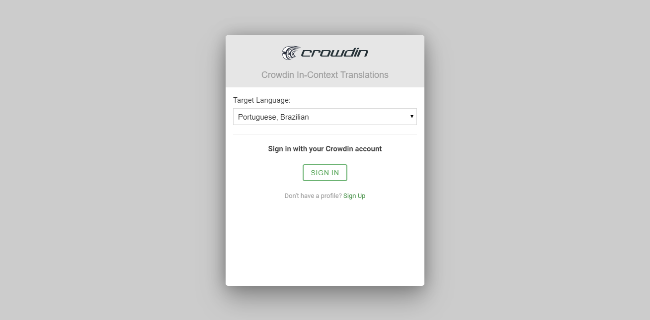 The first time you access YouTrack with the in-context localization feature enabled, you should see an invitation dialog that asks you to select a target language and sign in with your Crowdin account.