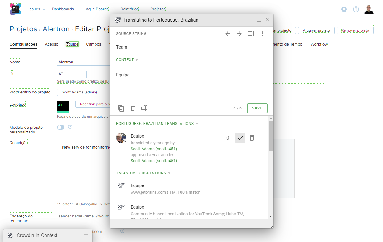 YouTrack supports community-based localization using Crowdin, a cloud-based localization management platform. This platform lets anyone who signs up for an account suggest translations to text strings in the YouTrack user interface.