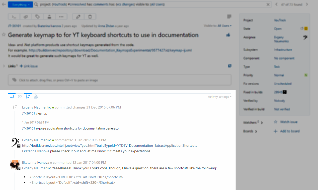 Here's an example of the activity stream filtered to show comments and VCS changes: