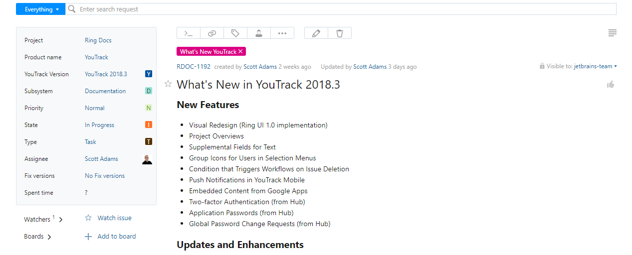 Updated by | Displays the full name of the user who last updated the issue. The date and time of the last update is also shown. Click the name to open the profile page for this user. |