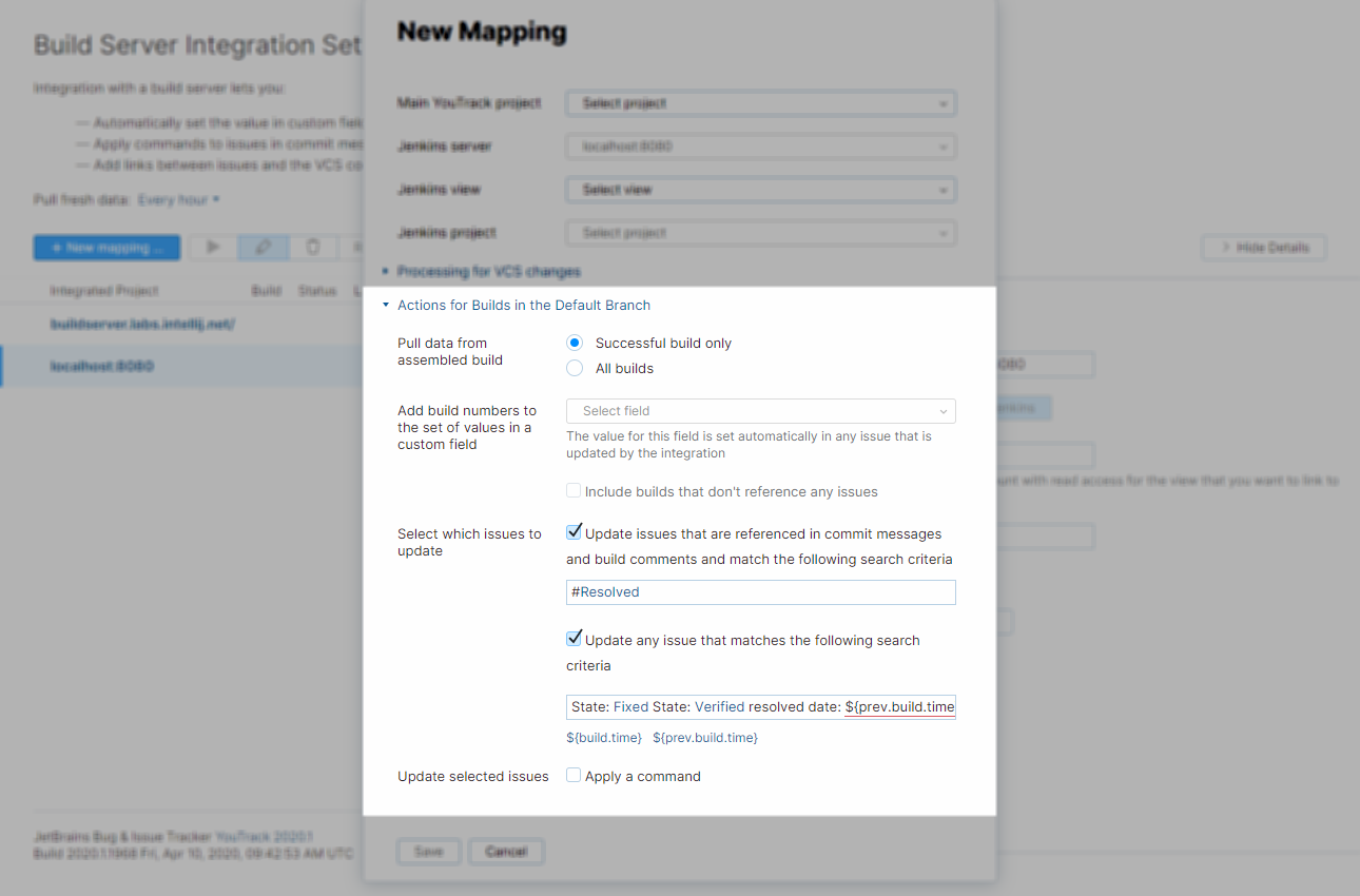 The following settings are available in the Actions for Builds section New Mapping dialog for a build server integration.