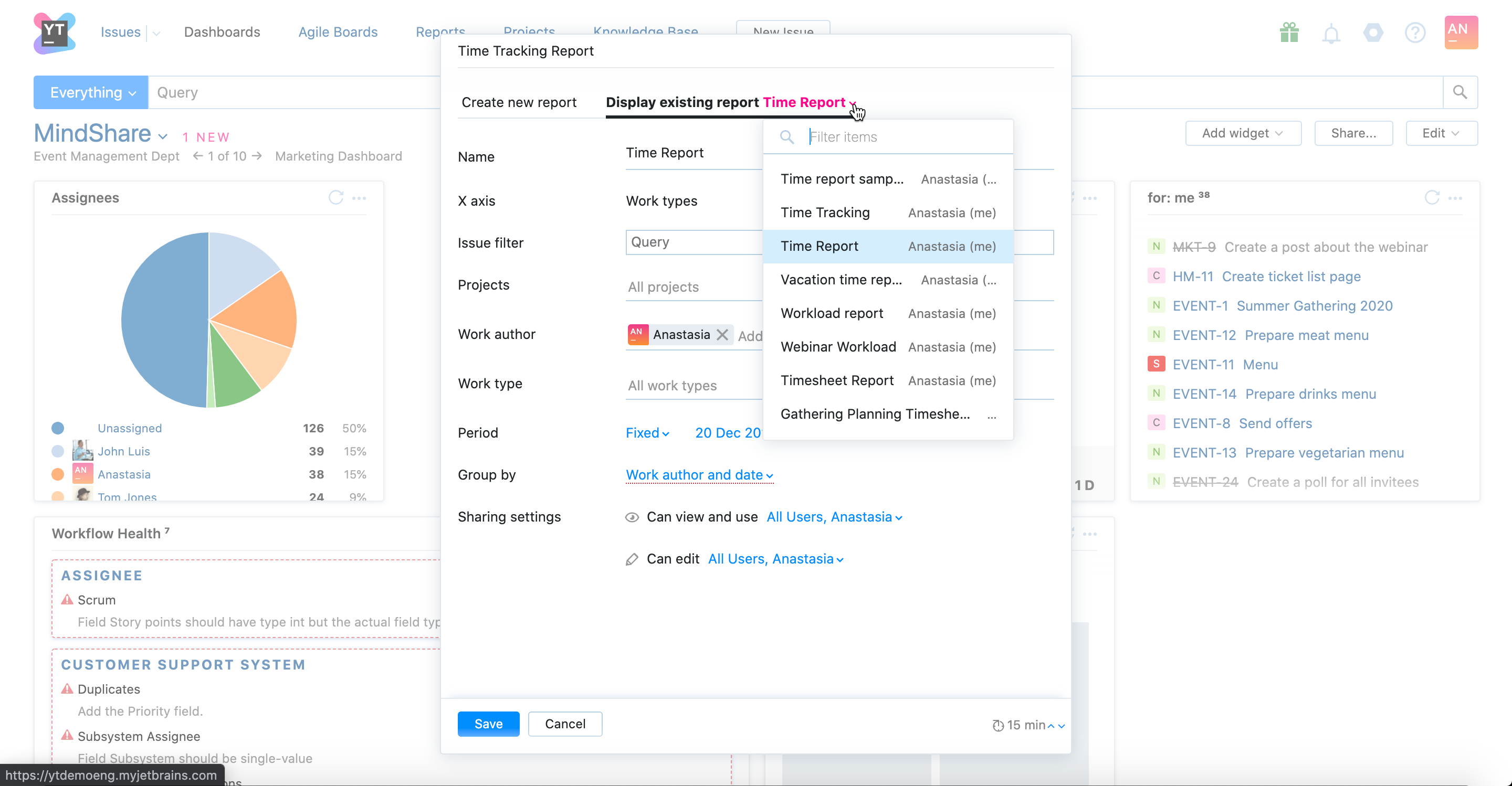 Use this widget to monitor how you or your team spend time working on issues in YouTrack.