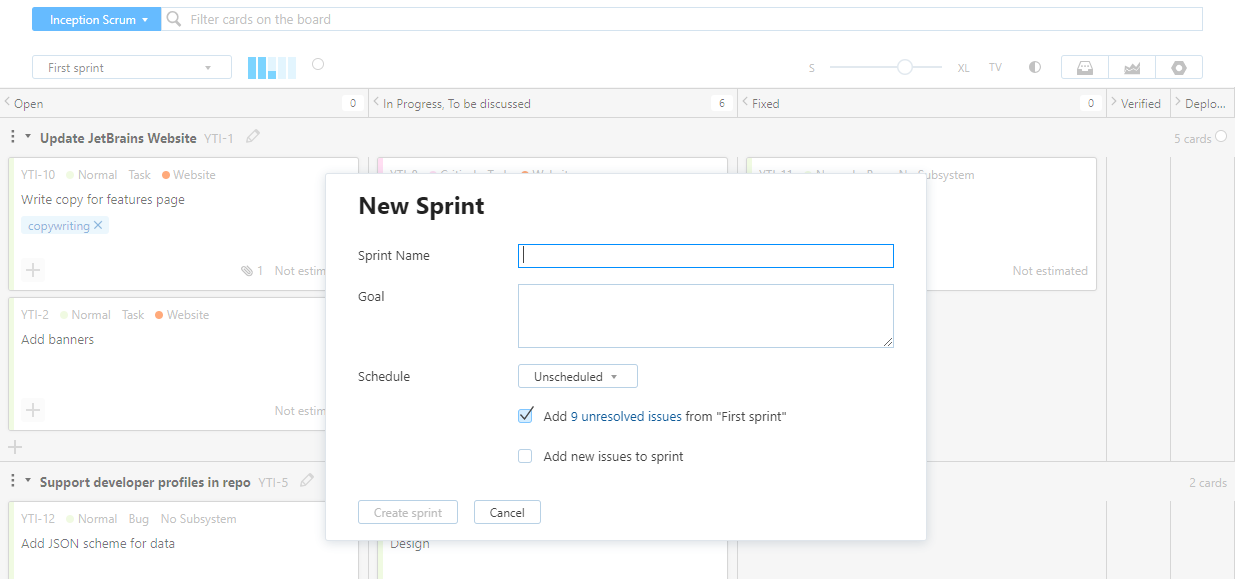 Add unresolved issues from current sprint | When enabled, all of the unresolved issues that are assigned to the current sprint are reassigned to the new sprint. This option is only visible when there are unresolved issues in the current sprint. |