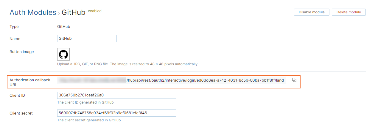 Client ID | Stores the identifier GitHub uses to validate a login request. You generate this value in GitHub when you configure the authorization settings for an application and enter a callback URL. |
