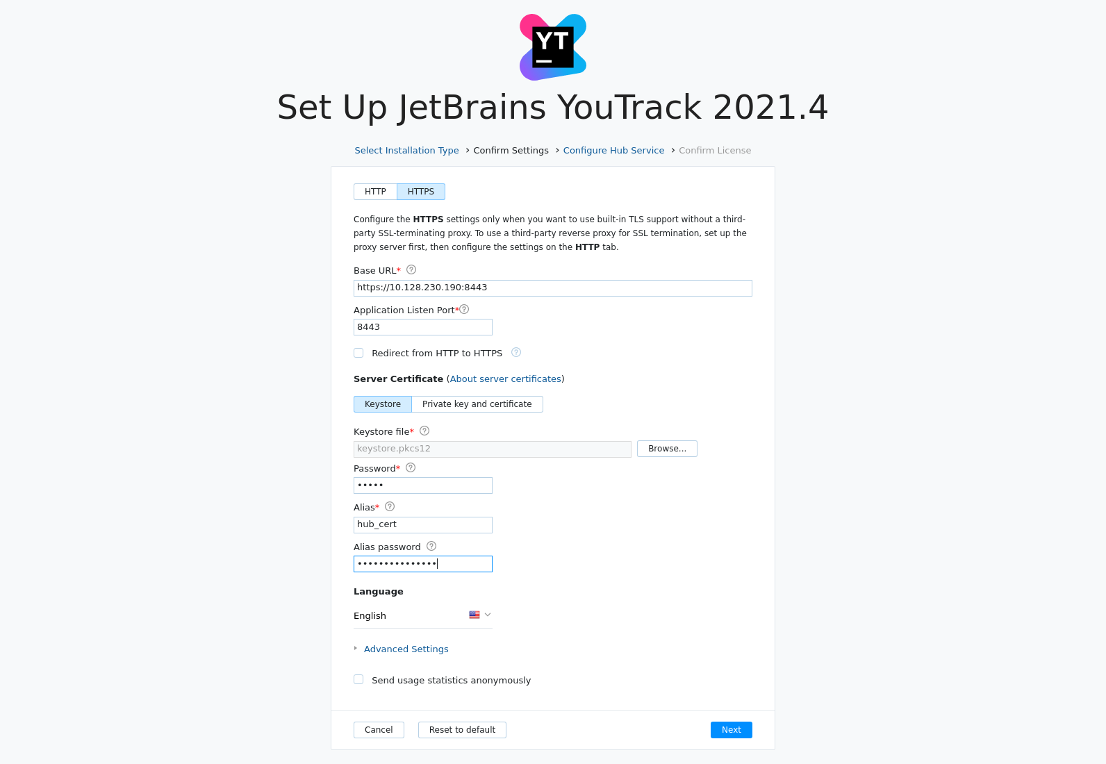 --no-browseroption. For example,./youtrack.sh start --no-browser.Continue with the installation in the web-based Configuration Wizard.