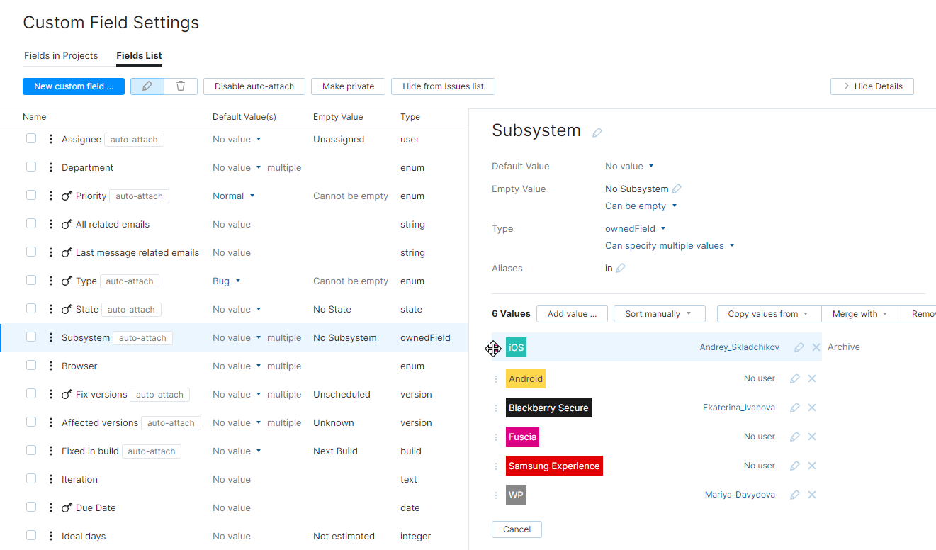 Sets of values are used in custom fields with enumerated types, like enum[1|*] or version[1|*]. The default custom fields State, Priority, and Build are also enumerated types. This page describes how to create, edit, and customize these sets of values.