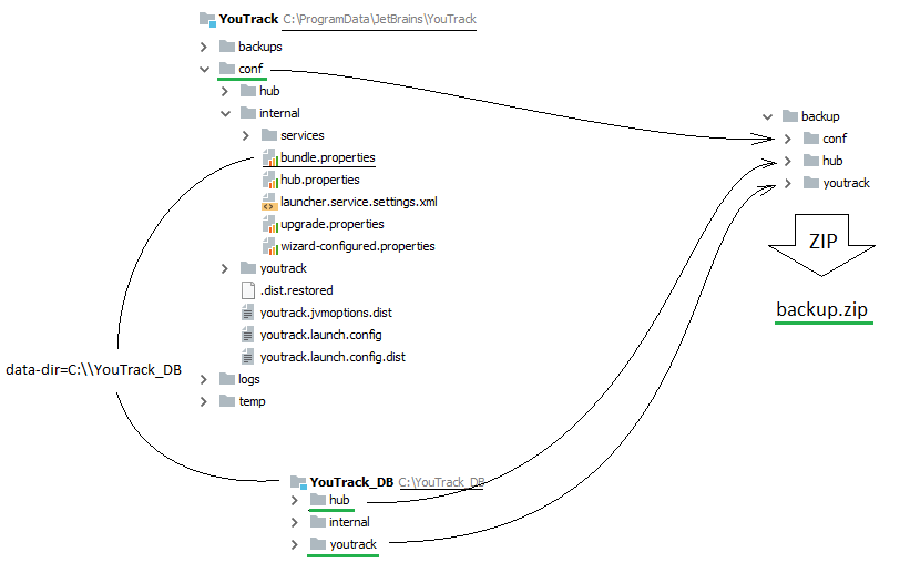 dataandconfdirectories. The default location of the directories that are created during installation is%programdata%\\JetBrains\YouTrack\.Note that an administrator may have changed the location where YouTrack stores these files. The path to the current location of the database is stored in the