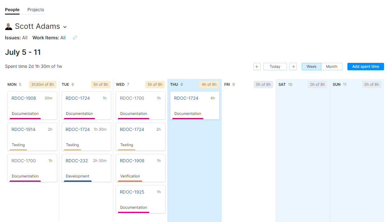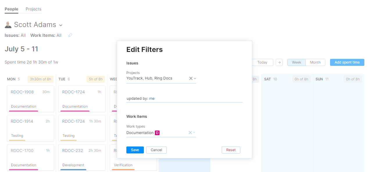 The filters on the People tab let you view work activity that relates to specific projects, matches a particular search query, or pertains to a subset of available work types.