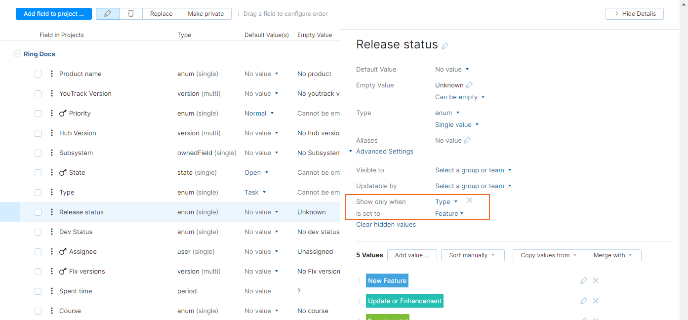 When one of the values specified here is selected in an issue that belongs to the project, the conditional field is shown.