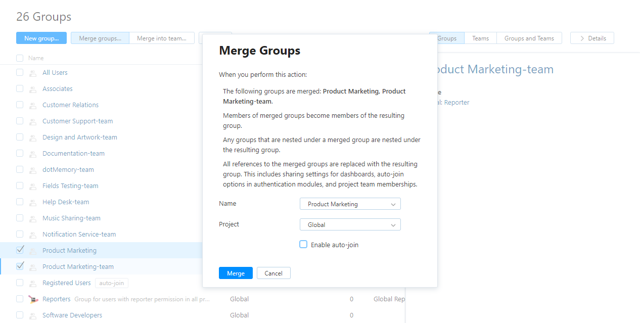 When you have organizational changes or encounter groups with overlapping access rights, you can merge one or more groups into a single group. This action is available on the Groups page.