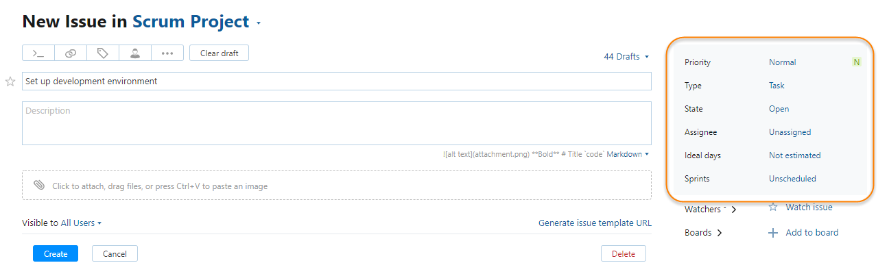 State | Used to manage the lifecycle of an issue. The set of values that are used for the State field has an additional Resolved property. The general idea is to move an issue from an unresolved state to a resolved state. In a project that follows the Scrum development methodology, these states are represented as columns on the agile board. The following set of values is pre-configured to represent unresolved states: