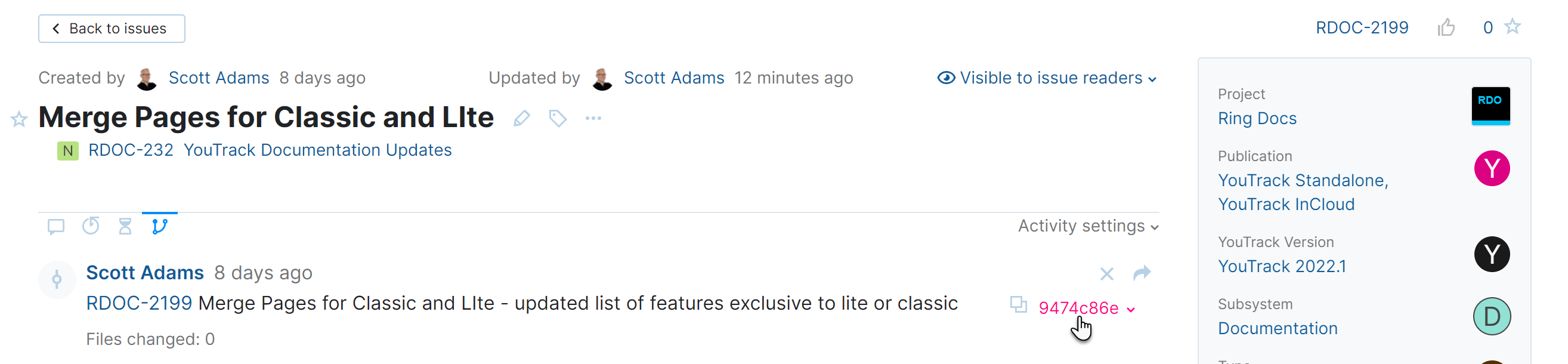 Paste commit hashes into an issue summary, description, comment, or string-type custom field to create links from YouTrack to the VCS.