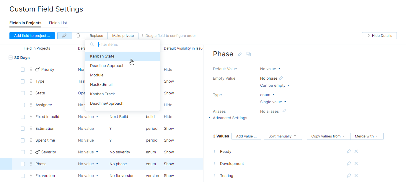 You can replace the custom fields that are used in a project with a custom field that is used in other projects. Use this feature if there are multiple projects that store similar values in different custom fields. You can then use the same custom field, for example, to generate reports or display the same columns and swimlanes for all the projects on an agile board.