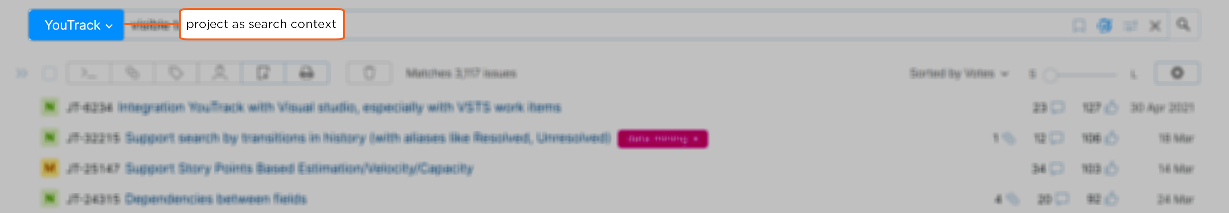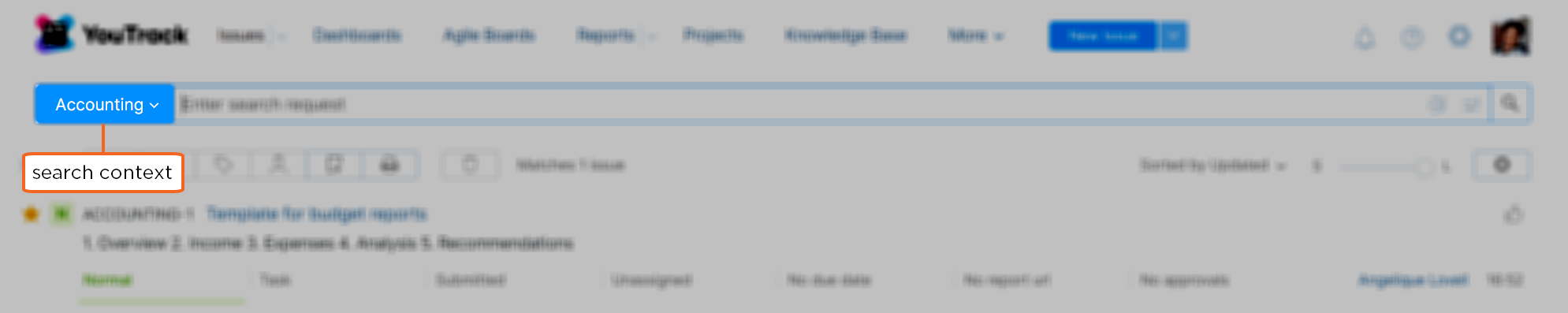 By default, the context is set to Everything. In this context, a search query returns all issues in YouTrack that are available to you. The following items are also available for use as a search context: